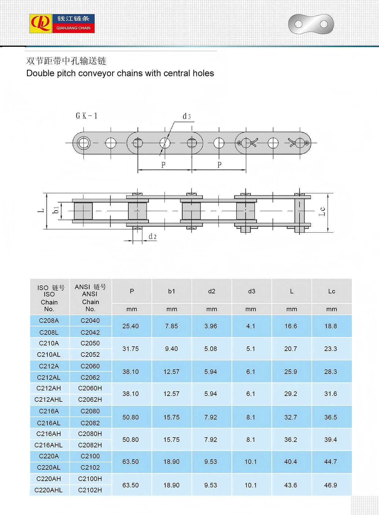 زنجیر نقاله دو گام با سوراخ های مرکزی